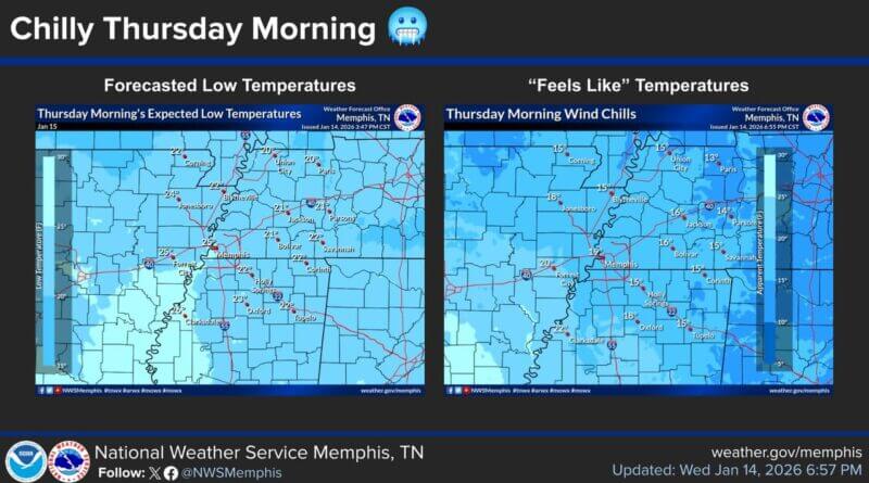 The front is expected to bring a chilly day with wind chill values in the low teens and 20s. Temperatures will not warm much tomorrow afternoon, with highs expected to range from the 30s in northwest Tennessee to the mid-40s in northern Mississippi.