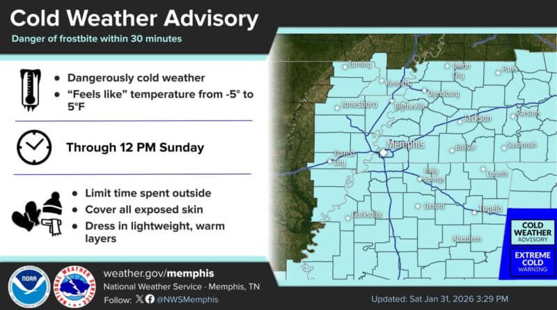 A cold weather advisory is in effect across the area through 12 p.m. Sunday, according to the National Weather Service.