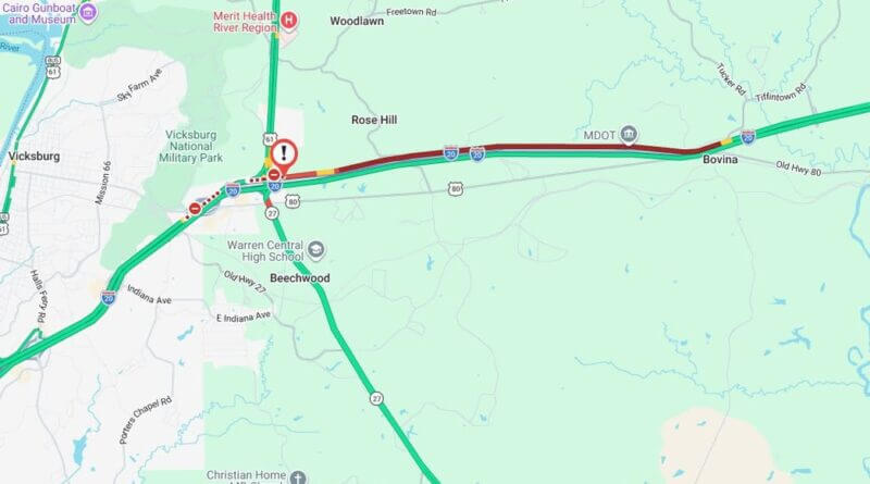 The MDOT traffic site identified the location as I-20 at U.S. 61 N / Rolling Fork exit 5A and showed congestion in the westbound lanes, according to its online traffic map.