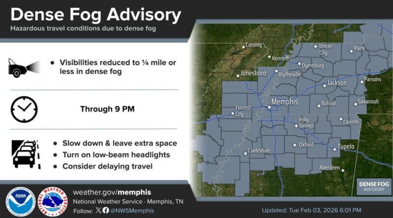 The National Weather Service has extended the Dense Fog Advisory until 9 p.m. CST tonight due to dense fog moving into northeast Mississippi from upstream areas, officials said.