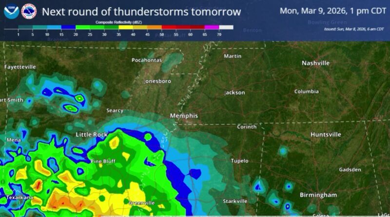 Forecasters say showers and thunderstorms are expected Monday, with a main severe window from about 1 p.m. to 8 p.m.