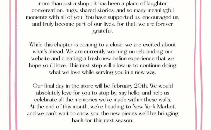 The boutique described the move as a transition rather than an end, calling the news “bittersweet” and saying it is excited about the future, the message said.