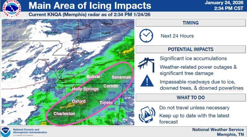 Freezing rain has begun falling across much of northeast Mississippi, according to local authorities. The precipitation is expected to intensify soon across the entire highlighted region, which is marked in pink on weather maps.