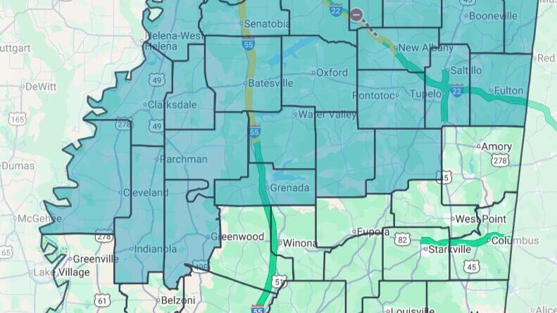 Counties affected include Alcorn, Benton, Bolivar, Calhoun, Chickasaw, Coahoma, DeSoto, Grenada, Itawamba, Lafayette, Lee, Leflore, Marshall, Panola, Pontotoc, Prentiss, Quitman, Sunflower, Tallahatchie, Tate, Tippah, Tishomingo, Tunica, Union, and Yalobusha.