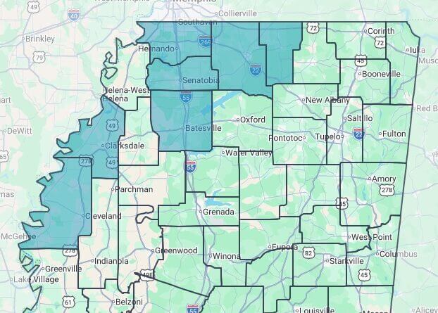 The affected counties include Benton, Bolivar, Coahoma, DeSoto, Lafayette, Marshall, Panola, and Tate. Officials advise drivers to use extra caution in these areas amid winter weather conditions.