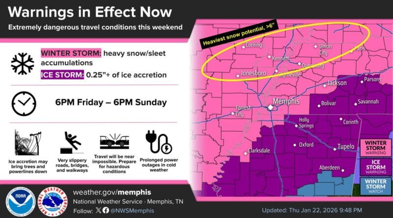 The National Weather Service in Memphis has issued winter and ice storm warnings for the Mid-South region. The agency warns residents to prepare for potentially hazardous conditions throughout the weekend.