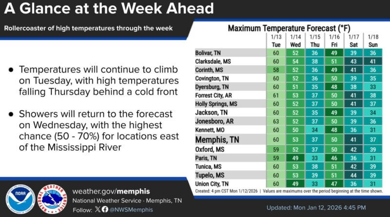 Temperatures across the Mid-South will fluctuate significantly in the coming days, with most areas reaching highs around 60°F on Tuesday, according to weather forecasts.