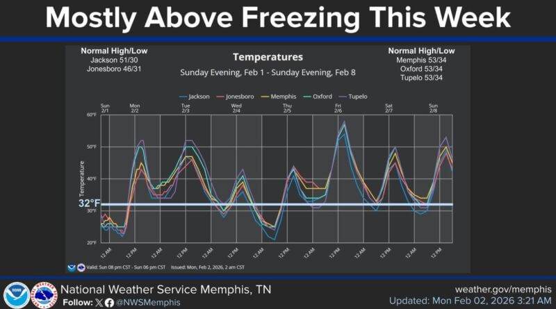 Temperatures in the Midsouth are expected to remain mostly above freezing throughout the week, according to the National Weather Service in Memphis.