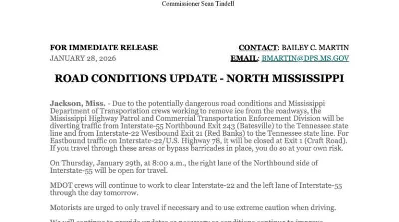 The Mississippi Highway Patrol and the Commercial Transportation Enforcement Division are diverting northbound traffic from Interstate 55 at Exit 243 in Batesville to the Tennessee state line. They are also diverting westbound traffic from Interstate 22 at Exit 21 in Red Banks to the Tennessee border.