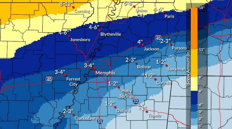 The National Weather Service in Memphis, Tennessee, has issued updated graphics showing snow, sleet, and ice accumulation totals from an approaching winter storm. The system is complex, and forecasts may change as new data becomes available, officials said.