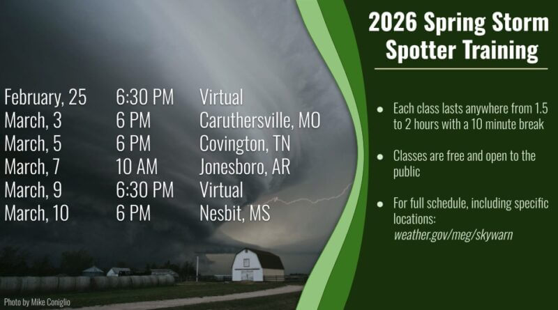 Interested individuals can view the full schedule at https://www.weather.gov/meg/skywarn. The agency plans to issue periodic reminders as class dates approach.