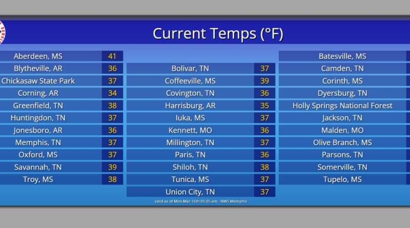 The National Weather Service in Memphis, Tennessee, said a cold front has cleared the region and an areawide Freeze Warning is in effect tonight.