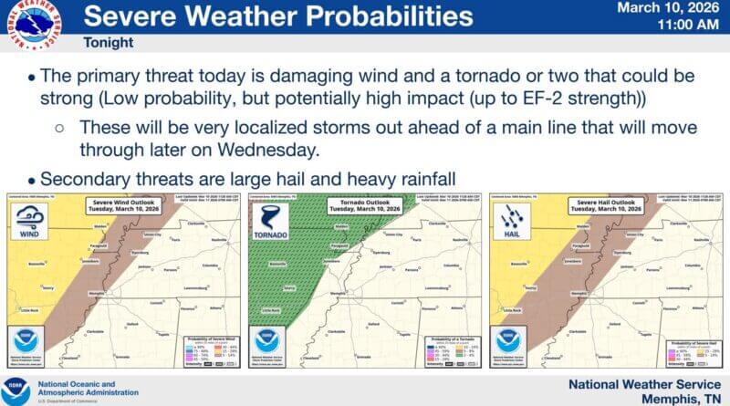 The service said greater uncertainty surrounds Wednesday’s setup because ongoing storms ahead of the frontal boundary could reduce how much instability remains. Damaging winds are expected to be the primary concern, with an increasing tornado threat over north Mississippi in the afternoon and evening.