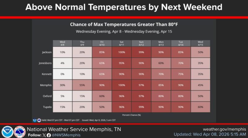 Temperatures are expected to rise further above normal across the Mid-South into the upcoming weekend, forecasters said.
