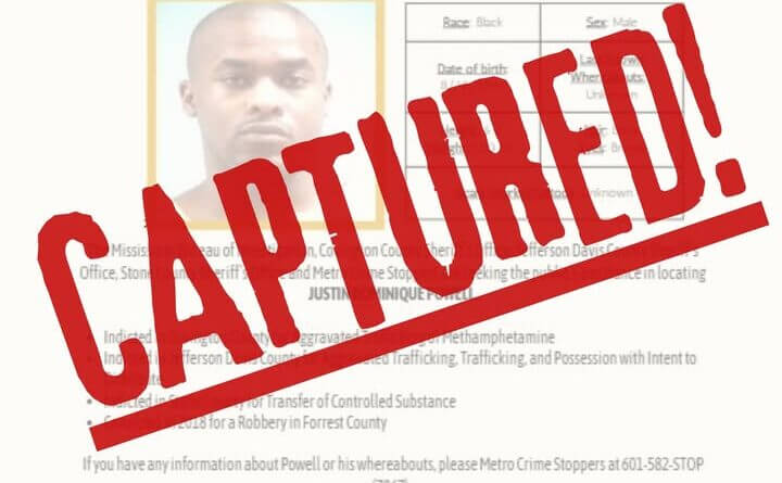 The U.S. Marshals Service announced the arrest of Justin Powell, who was listed on the Mississippi Most Wanted list.