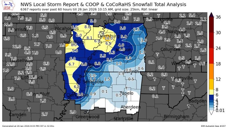 The National Weather Service in Memphis, Tennessee, provided preliminary data on snow, sleet, and ice accumulations from a winter storm that affected the region over the weekend.