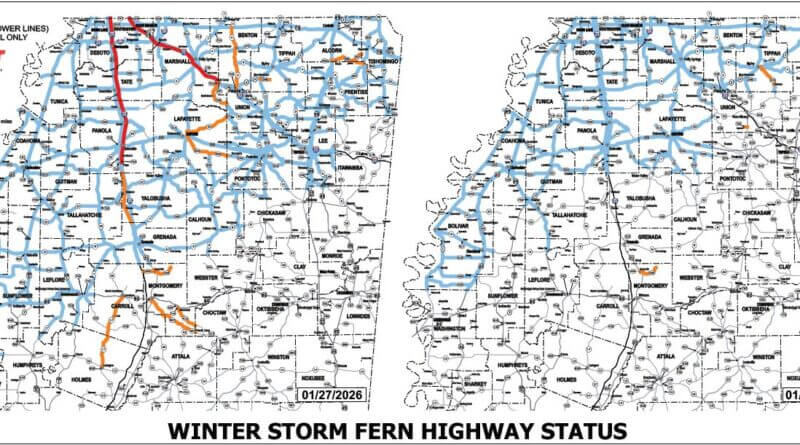 Road conditions in northern Mississippi remain hazardous Saturday as Winter Storm Fern continues to impact the region, according to the Mississippi Department of Transportation.