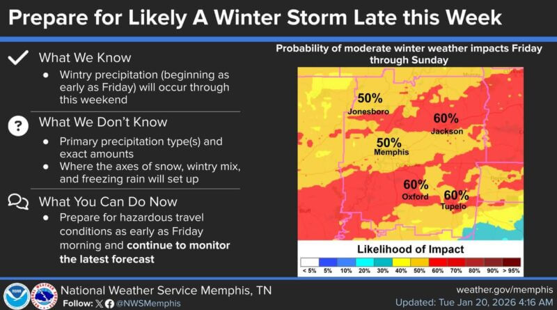 Confidence is increasing that a winter storm will affect the Mid-South from Friday through Sunday, according to the National Weather Service in Memphis. The exact amounts of snow, sleet, and freezing rain will depend on the storm’s upper-low placement, the agency said.