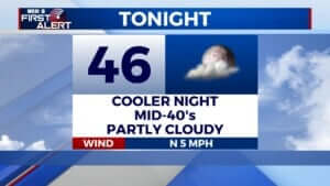 Monday’s high temperatures are forecast to climb into the low 70s with partly cloudy skies. Winds will come from the northeast at about 5 to 10 mph, WCBI said.