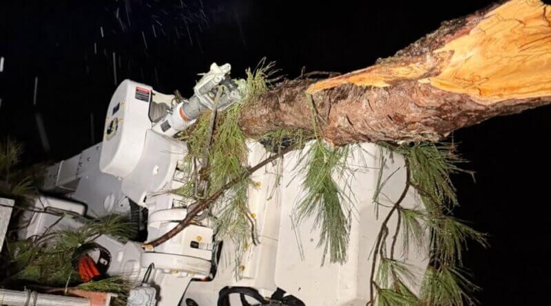 “We know it is frustrating for members who may be without power tonight, but these pictures show the main reason we will not be working all night. Trees are starting to break from the weight of the ice and at least one of our trucks has been hit by a falling tree. Thank you for your patience and your consideration of our safety.”