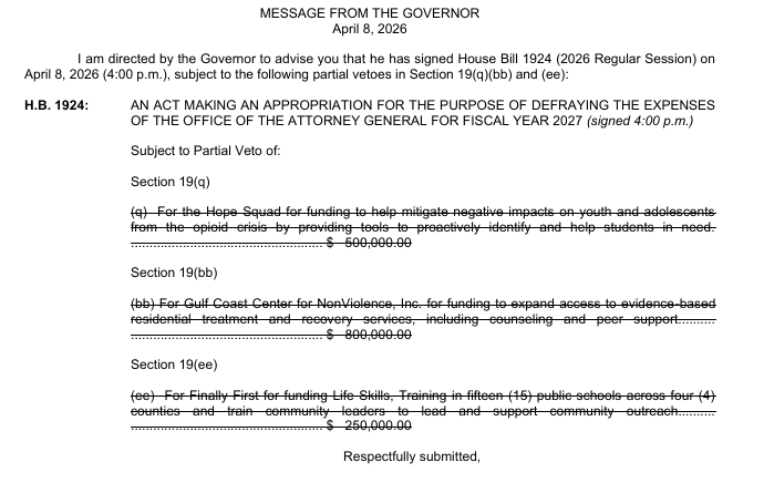 The cuts include $500,000 for Hope Squad to identify students in need related to the opioid crisis; $800,000 for the Gulf Coast Center for Nonviolence to expand evidence-based treatment and recovery services, including recovery and peer support; and $250,000 for Finally First to provide life-skills training to 15 public schools in four counties, Reeves said.