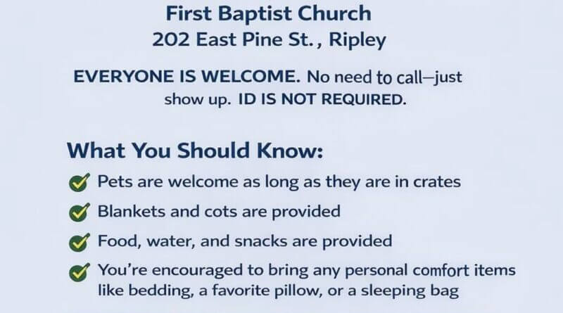 The American Red Cross announced that a warming shelter will open at 7 p.m. tonight at First Baptist Church, located at 202 East Pine Street in Ripley.