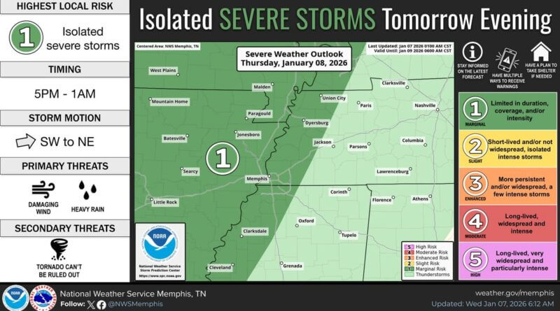 As reported by Local Source on January 7, 2026, Tippah County, Mississippi, faces an increased risk of severe weather later this week. The National Weather Service Memphis Tennessee has issued outlooks warning of damaging winds on both Thursday and Friday, with a possibility of a brief tornado or two in the area.