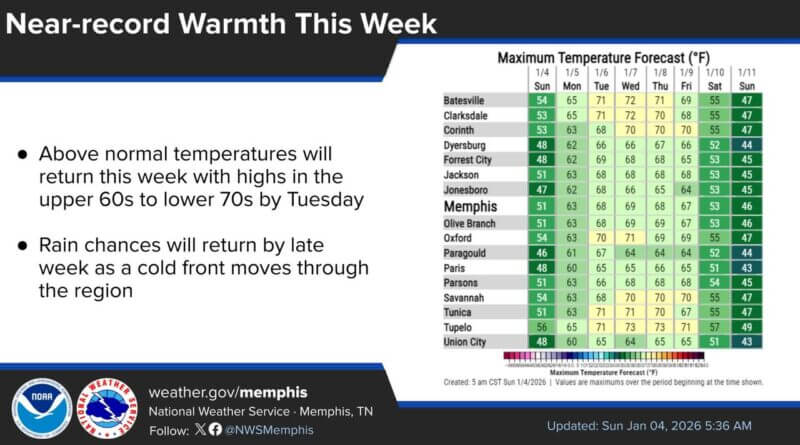 The upcoming weather pattern is part of a broader trend observed across the region, with officials advising residents to stay updated on forecast changes. The warm temperatures are expected to last through Wednesday, with rain moving into the area by Thursday or Friday. This weather shift could impact outdoor plans and agriculture activities in Tippah County.